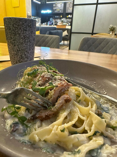 Ходим в эту кофейню с мужем уже около года практически каждый день, сервис здесь стабильно на уровне, все девочки очень вежливые и приветливые, очень приятно, когда тебя всегда встречают улыбкой и уже знают твою бонусную карту и твои предпочтения. Из блюд обожаю тут шницель и рис карри. Кофе стабильно хорош, муж часто берет эспрессо и всегда его хвалит. В общем, спасибо большое за это место, очень тут уютно и по-домашнему